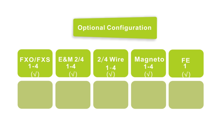 ◆  Voice port support FXO / FXS / E&M2-4  / 2-4 wire audio / magnet telephone interface, FXO port and program-controlled switches docking, FXS port and the user's telephone connected;