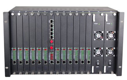 Ø The equipment is 6U high and 19 inch length include one fiber card(include SNMP) and 12 Pcs 30 FXO/FXS card.