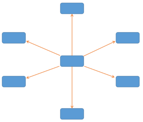 星型拓撲結構中,中央匯聚節點單元以放射狀連接到網中的各個結點。網絡中的各節點通過點到點的方式連接到一個匯聚節點(多光匯聚型交換機)上,由該匯聚節點向每個目的節點傳送信息。星型拓撲結構圖如下: