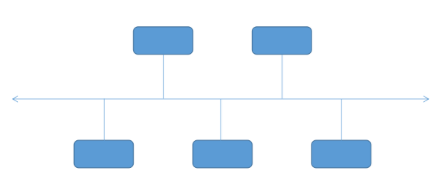 總線拓撲結構是將網絡中的各個節點設備用“一根總線”連接起來,實現計算機網絡的功能。任何連接在總線上的設備都能在總線上發信號,并且所有設備都能接收信號。總線型拓撲結構圖如下: