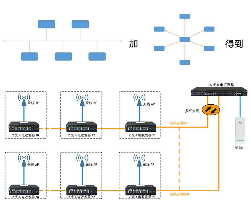 例如上圖:是多條總線結構(手拉手級聯)連接到一臺匯聚交換機,組合成更大的復合型網絡。