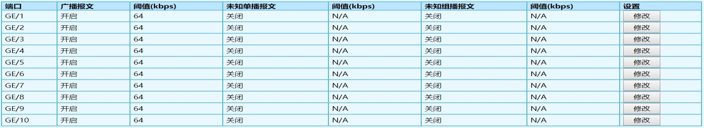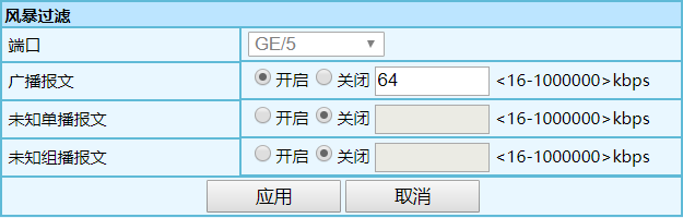 選擇是否開啟對未知單播報文的速率抑制。可通過單選按鈕進行選擇。 開啟 --如果選擇開啟,則要輸入相應的速率抑制值,<16-1000000>, 歩進為 16,單位為 kbps 關閉 |