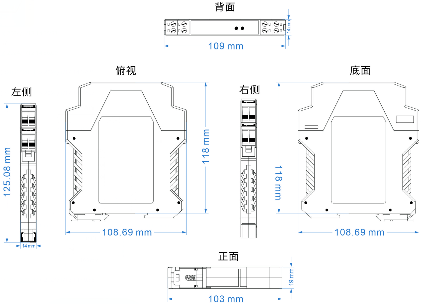 尺寸:97mm(長) x 54mm(寬) x 32mm(高) 安裝方式:35mm導軌安裝、壁掛式安裝 |