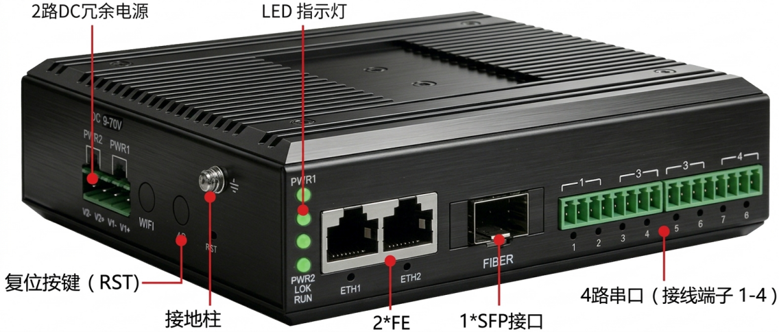 • 4*RS232/422/485軟件可配 • 300bps~921600bps • 2*FE可級連設備 • 1*SFP光口遠傳網絡 |