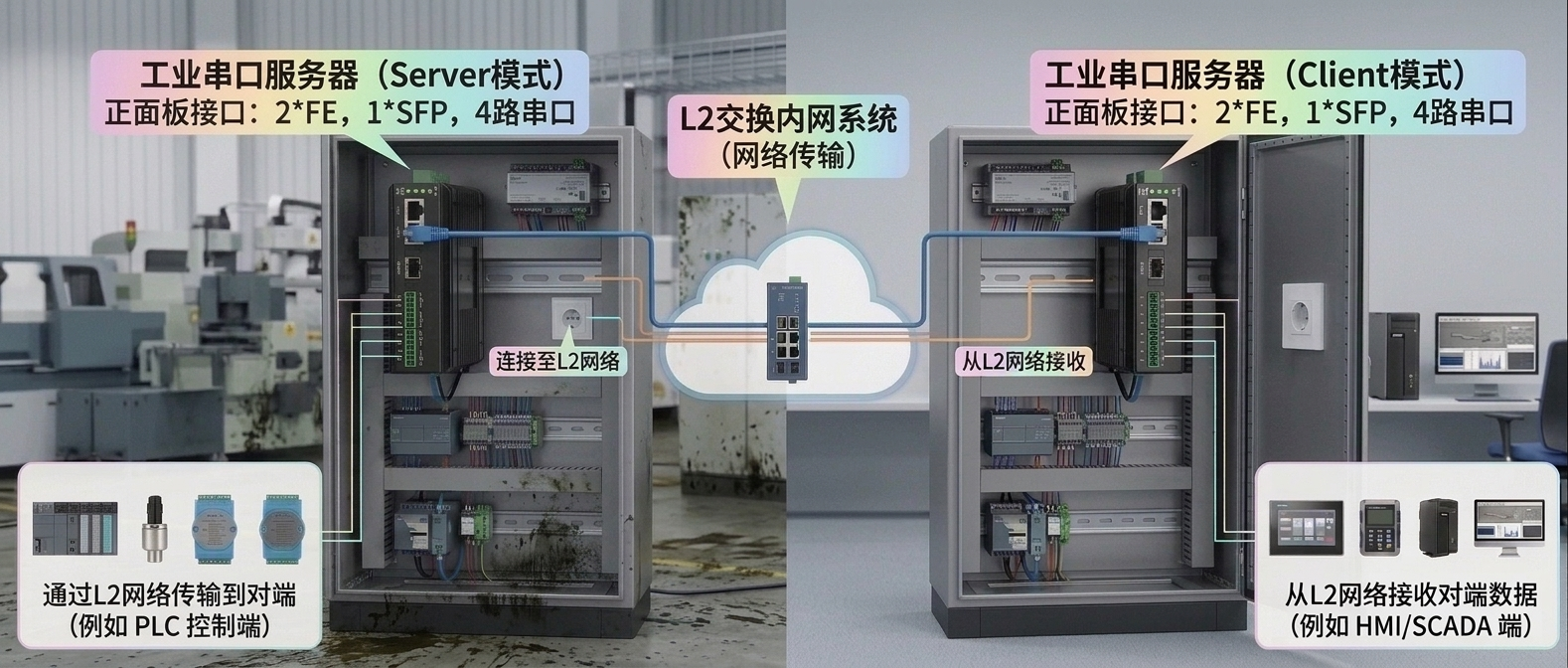 應用場景二:兩臺成對應用,中間通過網絡交換層傳輸1-4路串口