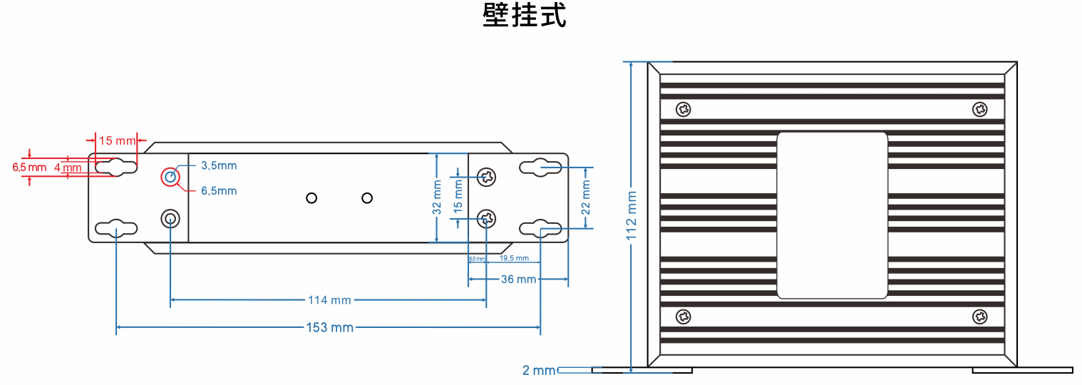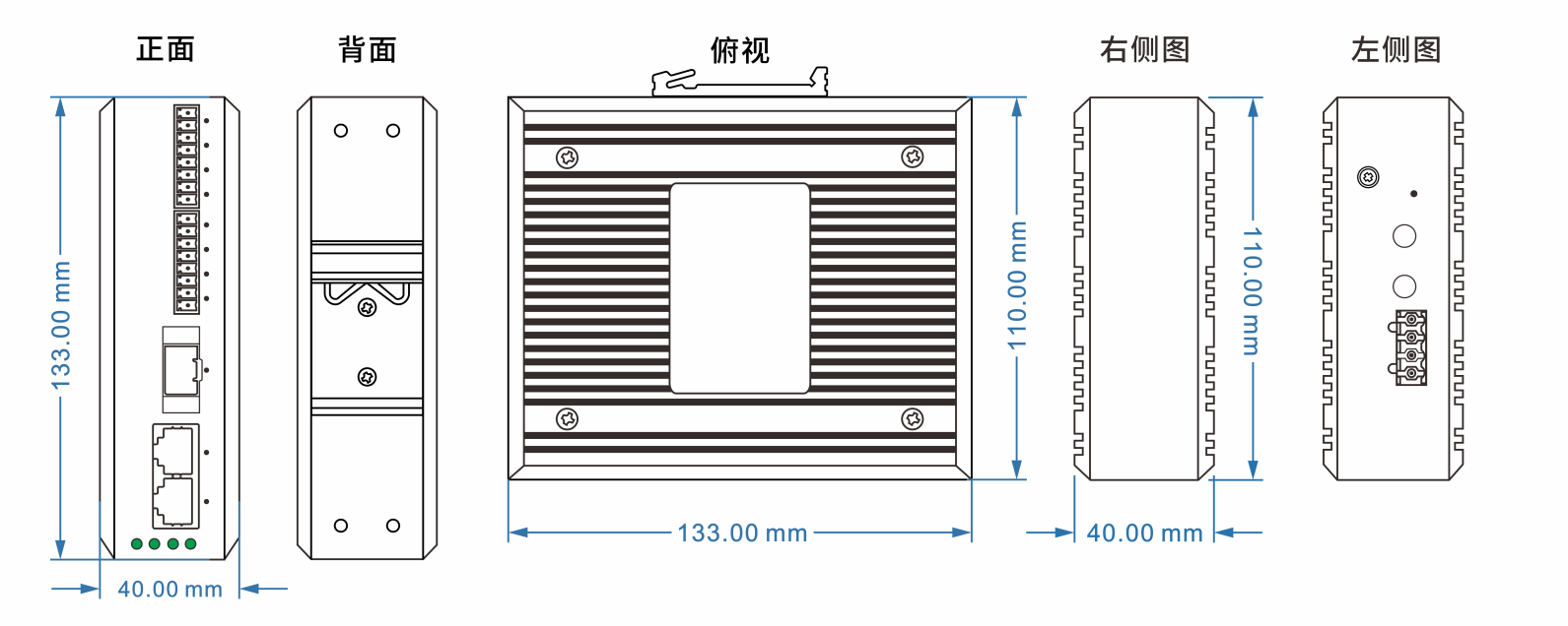 尺寸:133 × 120 × 40 mm 重量:0.65 kg 外殼:鋁合金陽極氧化,IP40 安裝:35mm DIN 導軌 / 壁掛 |