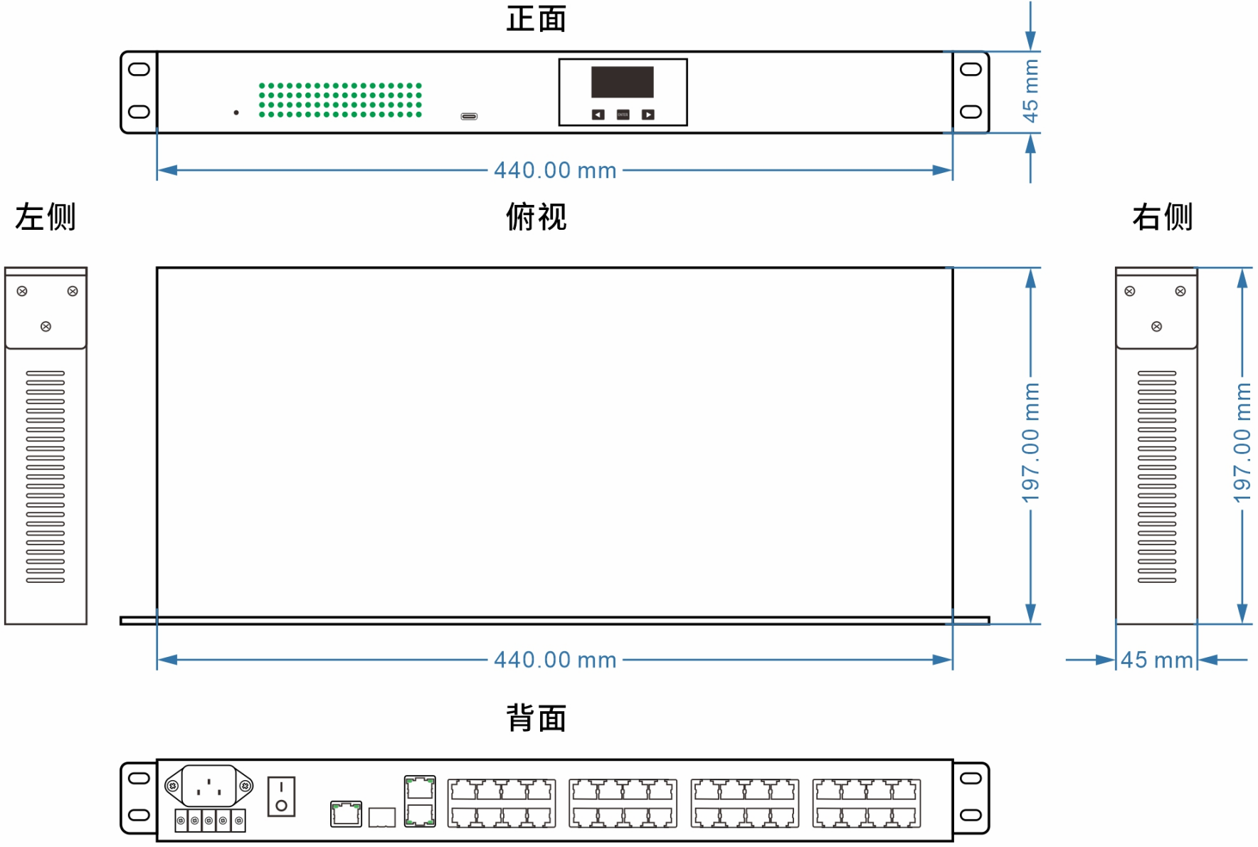 | 業務端口描述 | 32個RS232/422/485串行接口;2路千兆以太網電口,1路百/千兆以太網光口,一個Console接口,一個USB C口 |