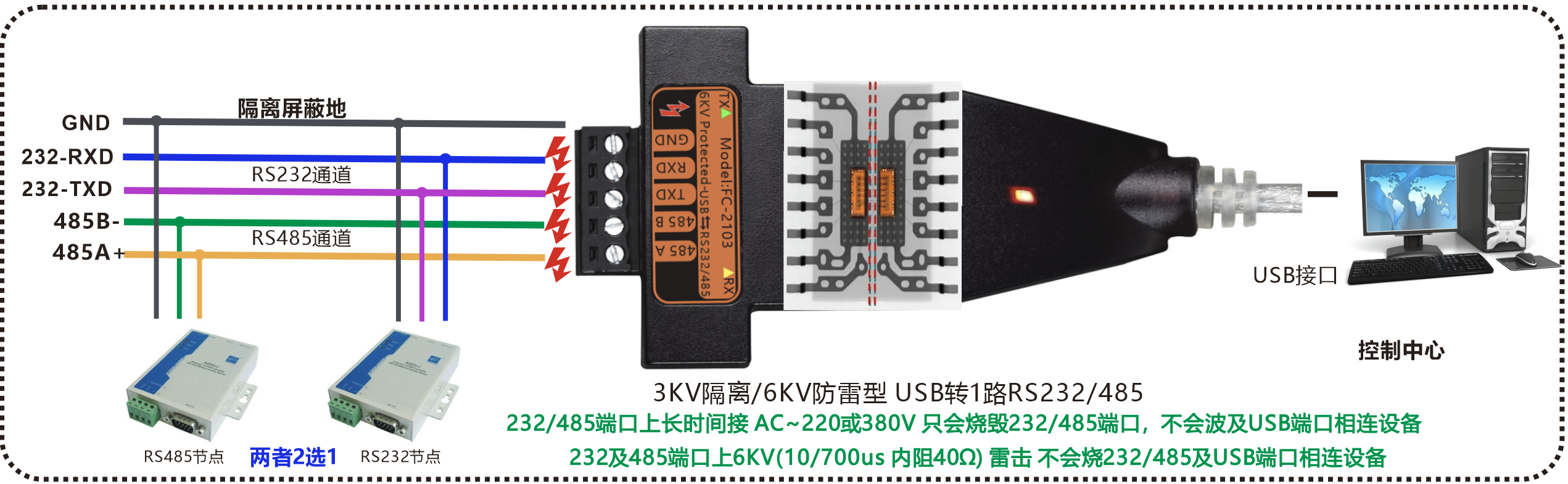 | 產品功能描述 | 防雷隔離型USB轉1路S232/485轉換器,帶USB線 | |||