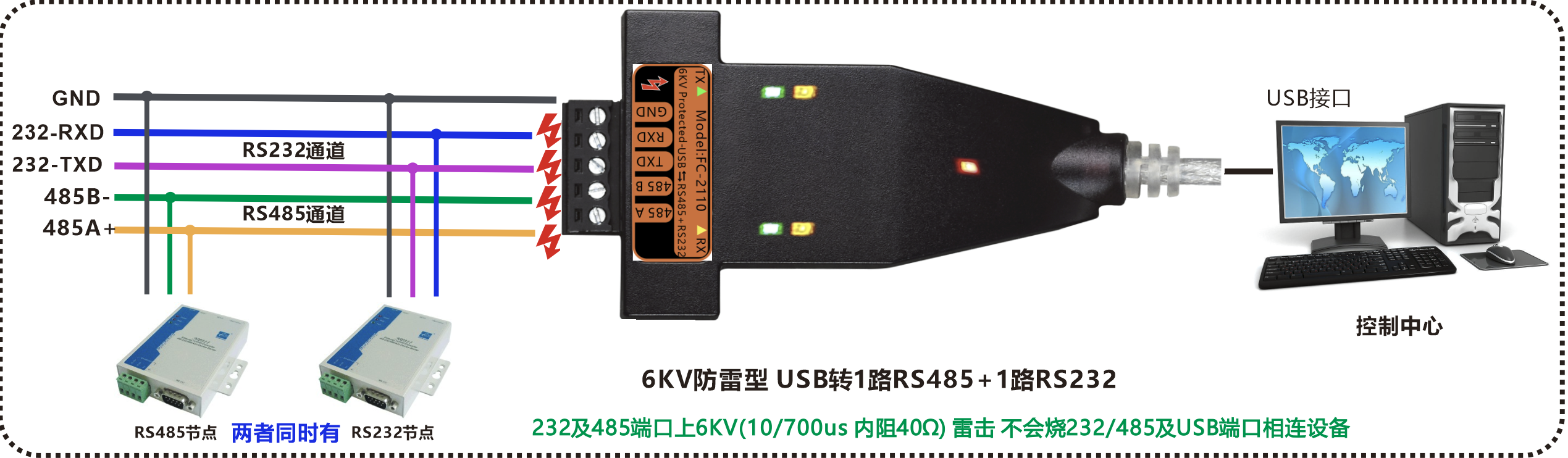 | 產品功能描述 | 防雷型USB轉1路高速RS485+1路RS232轉換器 |