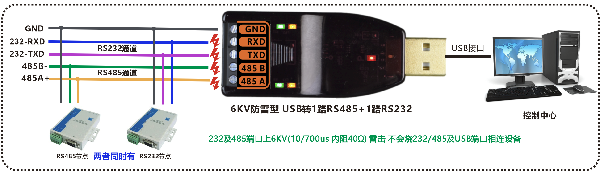 | 產品功能描述 | 防雷型USB轉1路高速RS485+1路RS232轉換器 |