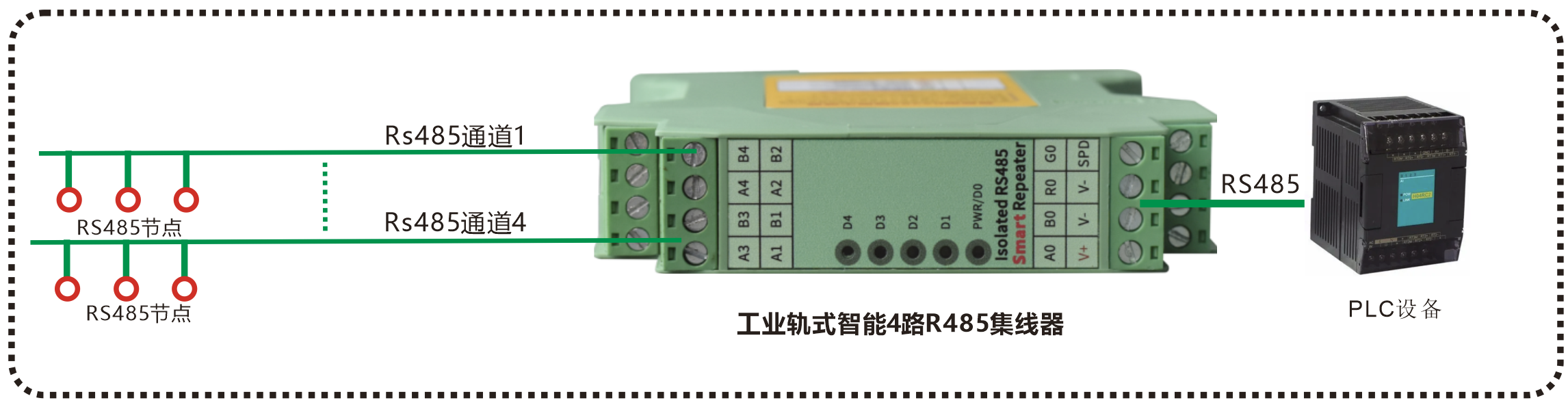| 產品功能描述 | 智能工業軌式 4路RS485集線器 |