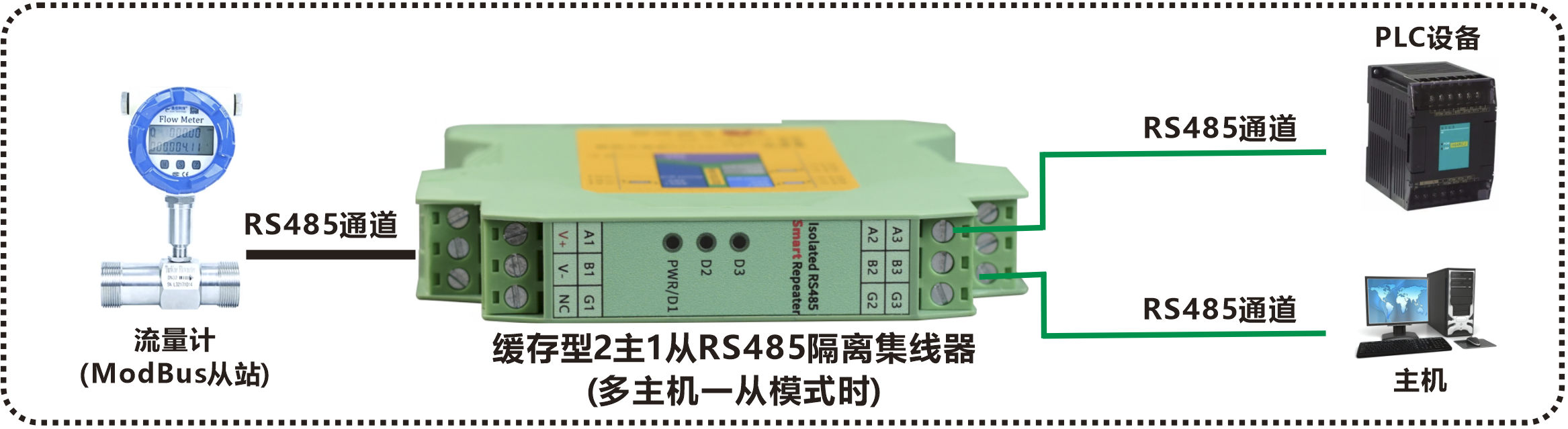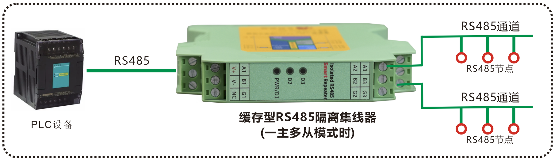 | 產品功能描述 | 緩存型 2主一從RS485隔離集線器 |