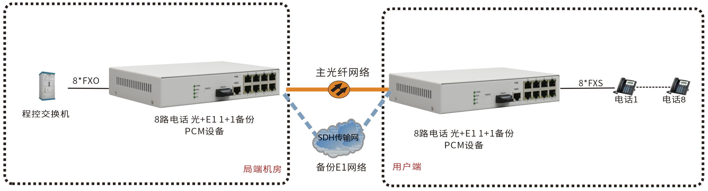 | 產品功能描述 | 在光纖+E1 1+1備份上同時傳送8路語音 |