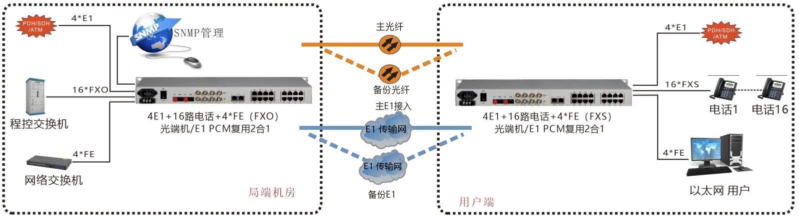 本系列產品,是在該公司研制的專用超大規模集成電路的基礎上,研發的點對點光傳輸與E1 PCM復用設備二合一產品。此款產品光纖傳輸時提供16路電話接口+4路E1接口+4路百兆以太網接口(100M帶寬),在E1傳輸入時提供16路電話接口+4路百兆以太網接口(1M帶寬);光纖可以1+1備份,E1可以1+1 備份,優先級為主光纖>備份光纖>主E1>備份光纖。