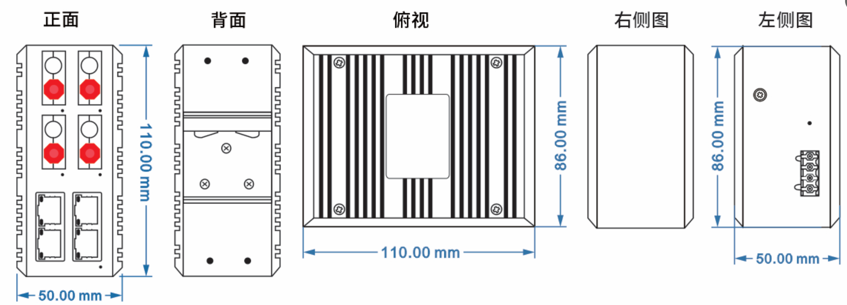 冗余雙電源輸入DC9-70V 過載保護:支持;反接保護:支持;冗余保護:支持 接入端子:4芯5.08mm間距插入式端子 |