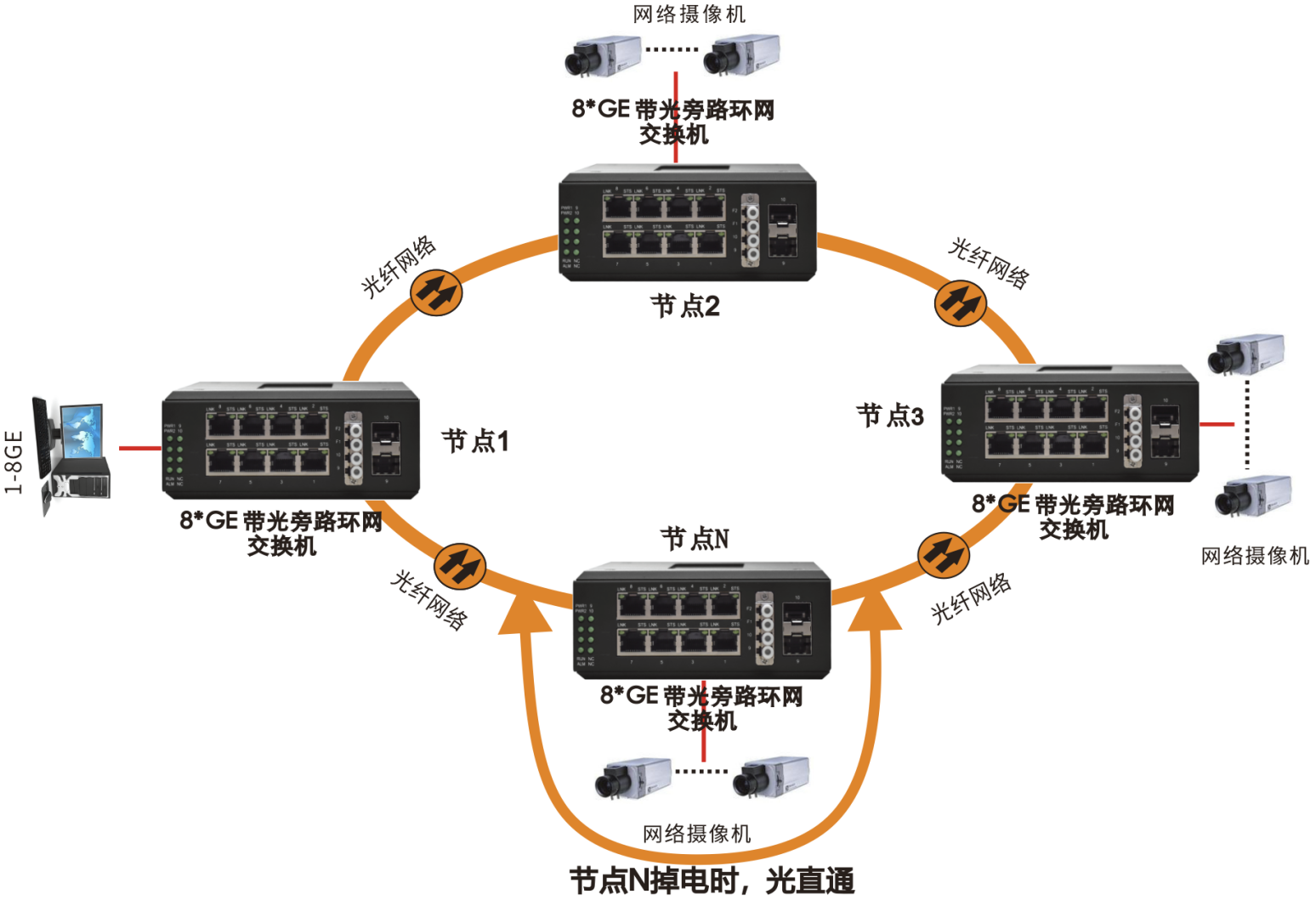 設備掉電時,兩個Bypass接口直通(F1,F2),設備有電時,這兩個光口可以當成千兆光以太交換接口;