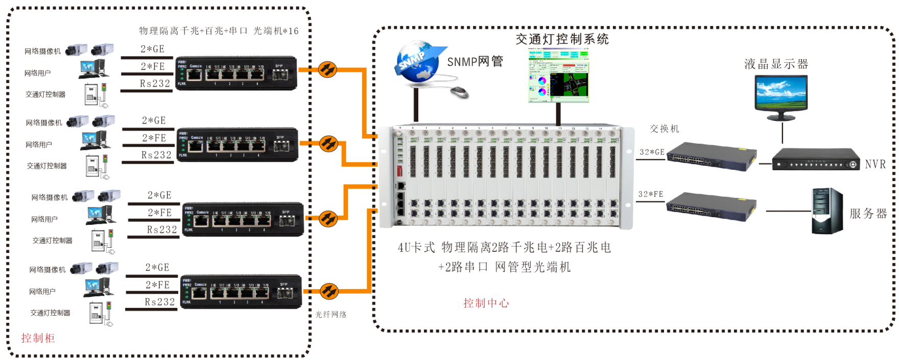 設備基于以太網交換芯片+FPGA方案,帶遠端OAM幀管理功能支持SNMP網管,也可以與4U插卡式的對應設備相連。