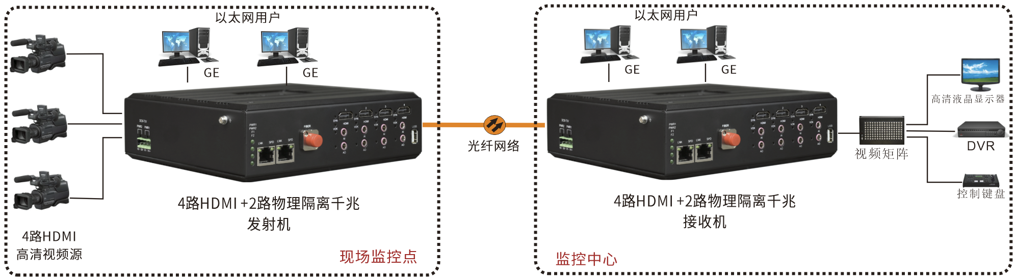 | 產品功能描述 | 在光纖上同時傳送4路2K HDMI 信號 + 2路物理隔離千兆以太網+1路USB |