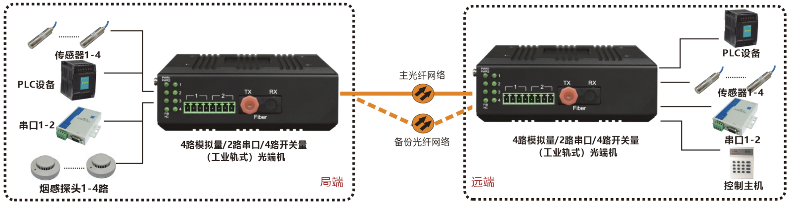 | 產品功能描述 | 在光纖上同時傳送4路模擬量接口或4路開關量或2路串口 |