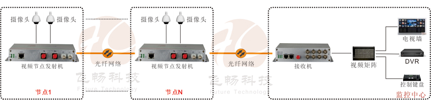 本產品均由光節點機和光接收機組成,節點機最多可同時傳輸2路正向視頻和1路RS485數據,接收機最多可接收16路視頻和1路RS485數據,一芯光纖鏈路最多可串接16個節點。