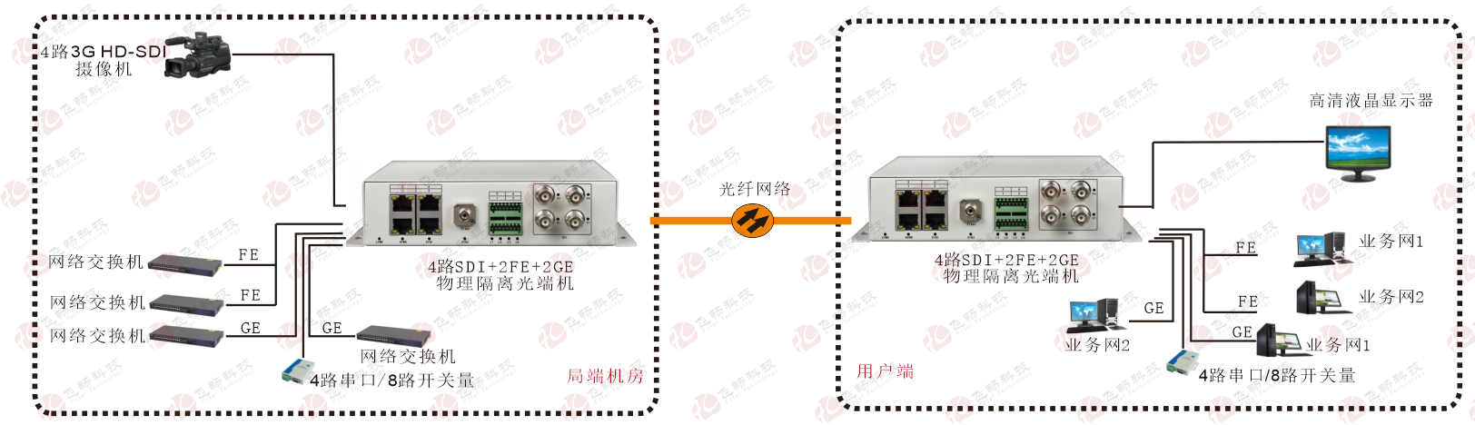 | 產品功能描述 | 在光纖上同時傳送4路3G HD-SDI視頻,1-8路開關量接口/1-4路RS232-422-485接口;2路千兆以太網(物理隔離),2路百兆以太網(物理隔離) |